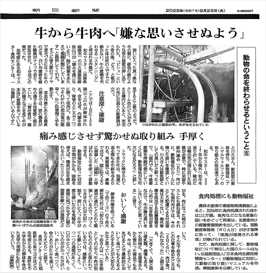 2025年9月23日の朝日新聞に掲載された記事「牛から牛肉へ『嫌な思いさせぬよう』」は、兵庫県内のと畜場(食肉センター)で働く方々の真摯な姿を紹介していました。